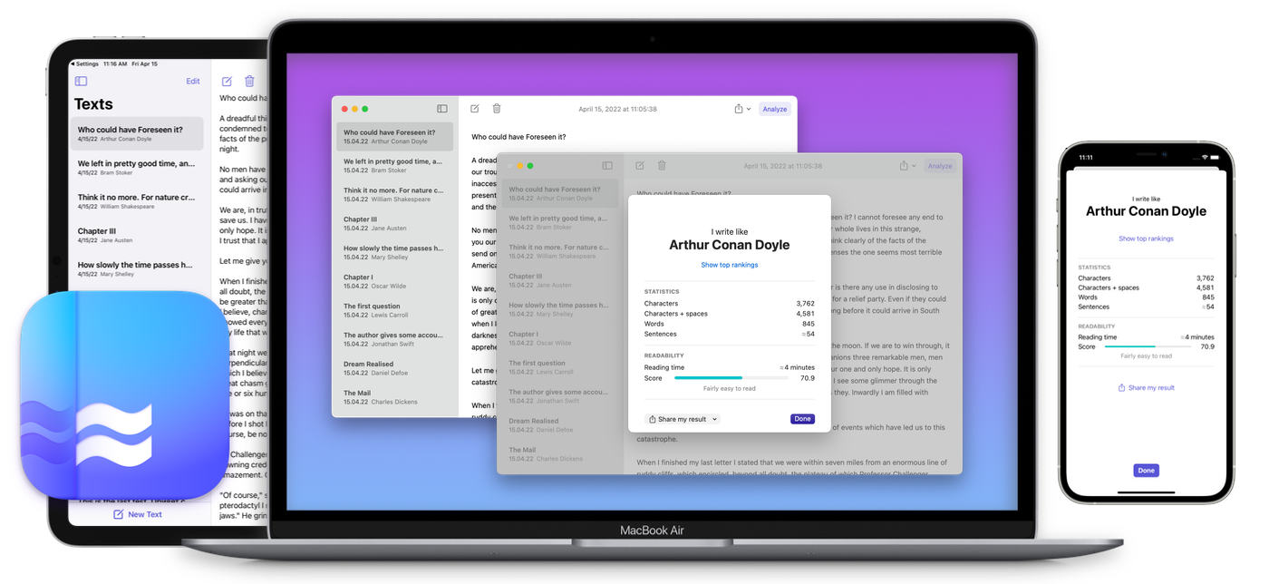 - Private, on-device analysis. With the app, you don’t have to be connected to the Internet to analyze your texts and you don’t have to send your writings to our server for processing.